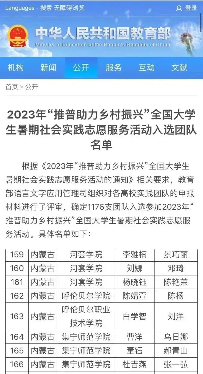 2023年“推普助力乡村振兴”全国大学生暑期社会实践志愿服务活动由教育部语言文字应用管理司和团中央青年发展部联合组织开展,经过组织申报、学校推荐、专家评审等程序,最终确定1176支团队入选。