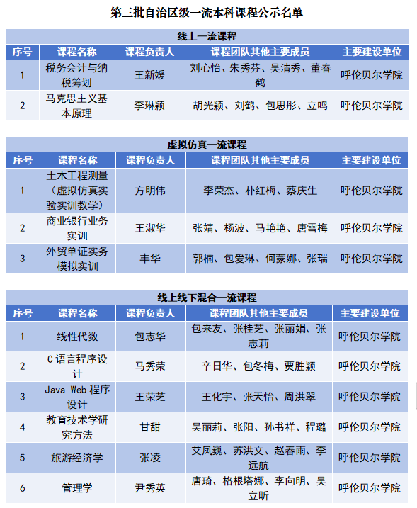 随后,内蒙古自治区教育厅公示“关于第三批自治区级一流本科课程认定结果”,我校《税务会计与纳税筹划》等25门课程成功入选,入选数量位居自治区高校前列,至此,我校自治区级一流本科课程达44门,这标志着我校课程建设水平迈上了新台阶。