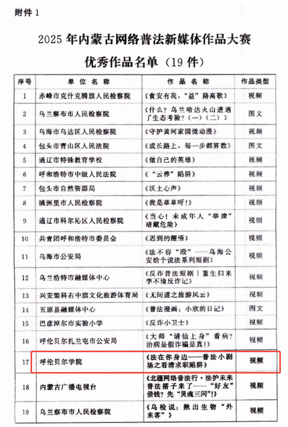 近日,2025年内蒙古网络普法新媒体作品大赛结果揭晓,我校选送的作品《法在你身边——普法小剧场之看清求职陷阱》脱颖而出,获评优秀作品,并成为全区唯一获奖高校,充分展现我校在普法领域的实践成效。