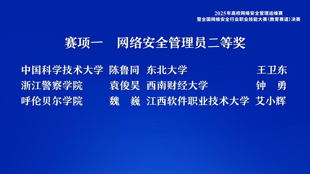 近日,由教育部教育管理信息中心指导、中国教育技术协会主办,中国教育技术协会网络安全专委会、上海交通大学、北京大学承办的“2025年高校网络安全管理运维赛暨全国网络安全行业职业技能大赛(教育赛道)”在上海交通大学圆满落幕。本次大赛自2025年8月启动以来,吸引了全国704家教育行政单位和高校的2246名师生积极参与,在此项全国性的高水平赛事中,我校网络中心教师魏巍,荣获网络安全管理员赛项全国二等奖;梁鑫鑫,荣获渗透测试员赛项优胜奖,充分展现了我校在网络安全领域的专业实力。
