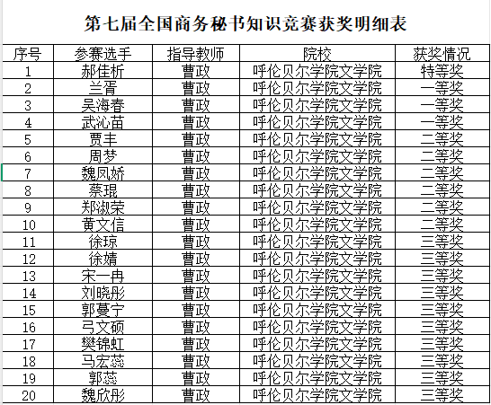 近日,第七届全国商务秘书专业知识竞赛圆满落幕,我校文学院秘书学专业学子凭借扎实的专业功底与出色的实践能力脱颖而出,在全国近6000名参赛者中勇创佳绩,斩获多项重量级奖项。其中,郝佳析同学摘得特等奖桂冠;兰胥、吴海春、武沁苗3名同学荣获一等奖;贾丰、周梦等6名同学斩获二等奖;徐琼、徐婧等10名同学喜获三等奖,获奖覆盖面与含金量均位居前列。