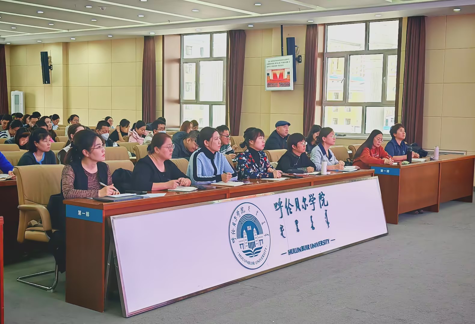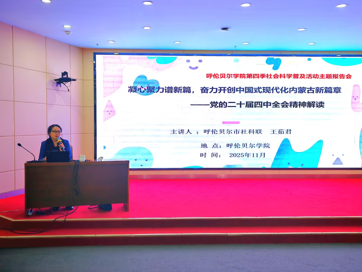 为深入学习贯彻党的二十届四中全会精神,推动社会科学知识普及与理论武装深度融合,11月25日上午,我校在崇文楼A501会议室举行了第四季社会科学普及活动主题报告会。呼伦贝尔市社科联副主席王茹君以“凝心聚力谱新篇,奋力开创中国式现代化内蒙古新篇章”为主题作专题报告,来自各部门和呼伦贝尔学院社会科学普及基地的120余名干部及教师代表集中聆听了主题报告。
