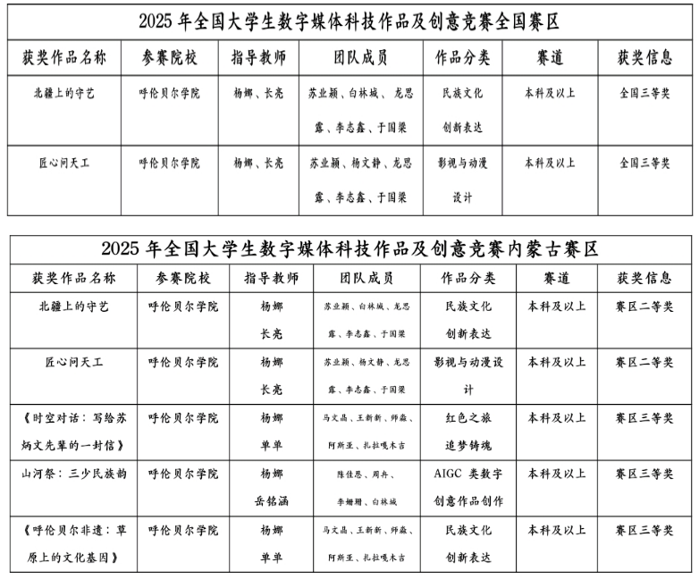 近日,2025年全国大学生数字媒体科技作品及创意竞赛圆满落幕。作为数字媒体领域极具影响力的全国性赛事,我校文学院新闻学专业学子凭借扎实的专业功底、出色的实践能力与创新思维脱颖而出,在内蒙古赛区与全国总决赛中双线告捷,斩获多项重量级奖项,充分展现了专业实践育人的丰硕成果。
