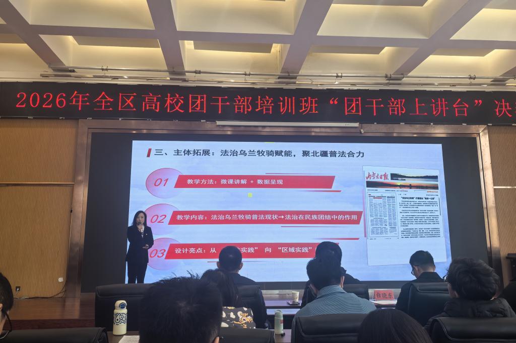 3月13日,由共青团内蒙古自治区委员会主办的2026年全区高校团干部培训班“团干部上讲台”决赛在呼和浩特市举办。我校旅游地理与历史文化学院团总支书记王艺淳获得“理论微宣讲组”二等奖,法学与经济管理学院团总支书记赵婷获得“团课设计组”优秀奖。