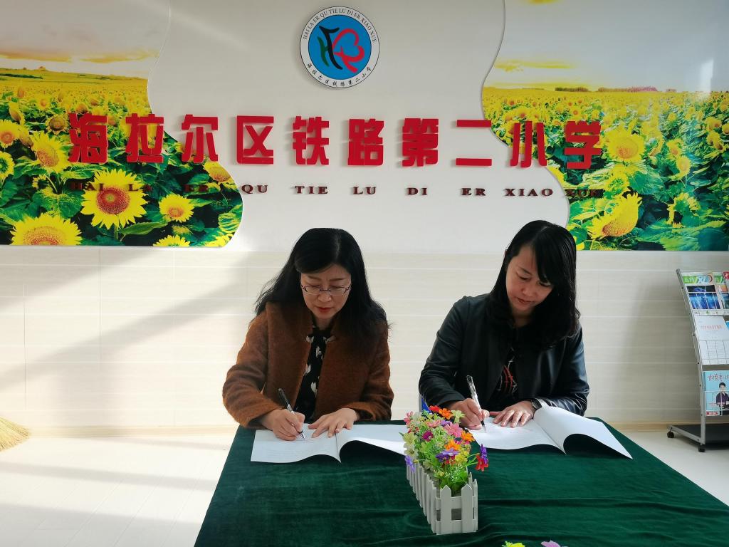 在海拉尔区铁路第二小学,刘波校长代表学校对传媒学院各位领导的到来表示热烈欢迎,她对铁路第二小学的基本情况做了介绍,并表示教育实习基地的建立,对铁路第二小学信息技术课程教学和创客空间的开展具有积极作用。王晓莉院长对铁路第二小学为我院提供见习、实习基地表示感谢。并进行实习基地挂牌。