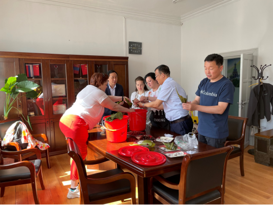 我校外籍教师与中方教师共同参与包粽子活动。活动期间,中外教师欢声笑语,气氛和谐。一片片粽叶、一粒粒糯米,在大家一双双灵巧的手中,变成了香甜可口的粽子。外籍教师也给大家带来了自制的俄罗斯美食,与大家共同品尝美味,整个活动现场洋溢着浓浓的节日氛围。
