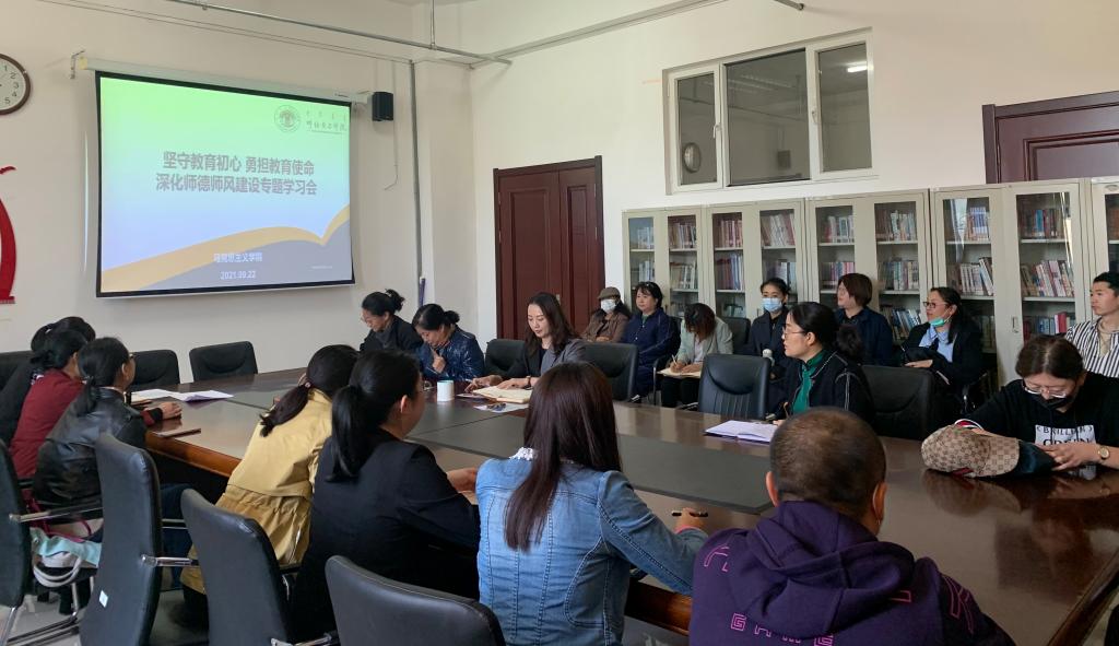 按照《全面深化新时代教师队伍建设改革的意见》和教育部等七部门印发的《关于加强和改进新时代师德师风建设的意见》等文件精神,根据教育部等六部门印发的《关于加强新时代高校教师队伍建设改革的指导意见》和呼伦贝尔学院师德师风专题学习月活动要求,进一步推进师德师风建设常态化发展,9月22日下午,马克思主义学院在崇文楼B123会议室开展“坚守教育初心、勇担育人使命、深化新时代师德师风建设”专题学习会,学院全体教师参加活动。