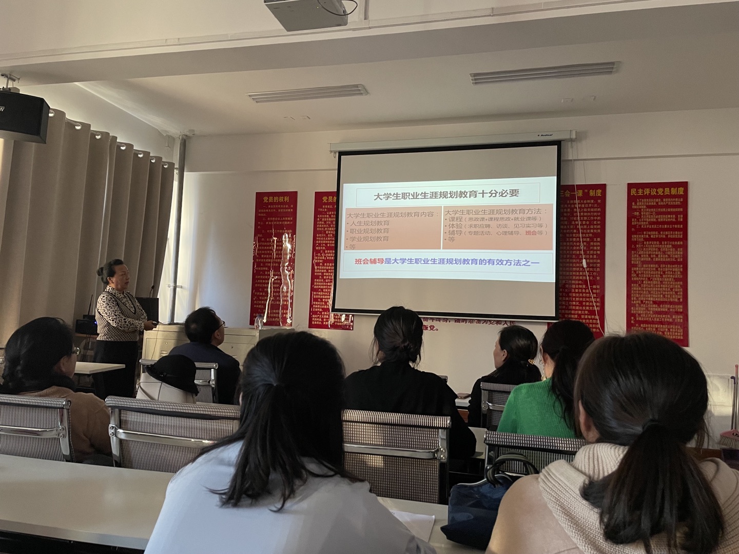 于晓梅教授以“大学生职业生涯规划辅导员班会方案”为题,围绕大学生职业生涯规划的必要性、如何开展大学生职业生涯规划辅导、职业生涯规划主题班会设计与实施等方面进行了讲授,并分享了如何结合各专业学生的实际情况和教学内容合理的设计班会内容,形成一套完整、系统、科学有效的职业生涯规划主题班会方案。