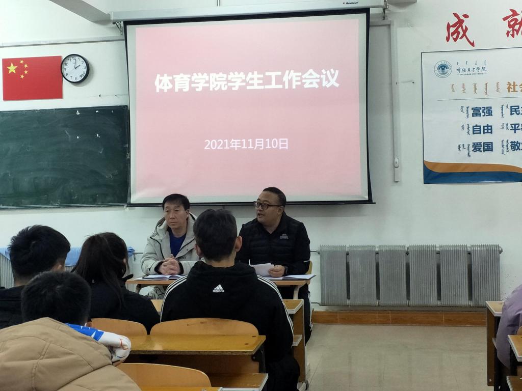 为了进一步加强学风建设,增强学生学习的积极性和主动性,促进大学生的健康成长和综合素质的全面提高,认真做好本学期学院的各项学生工作,根据学校疫情防控要求,11月10日-18日,体育学院分批召开了2019级、2020级、2021级全体学生学风建设暨安全教育工作会议。体育学院党总支副书记胡日查,副院长林剑冬以及全体辅导员和班主任参加了会议。