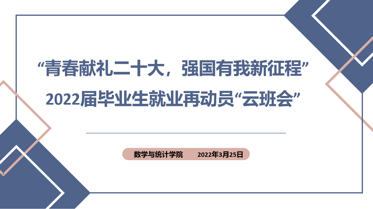 为全力推进2022届毕业生就业工作,3月17至28日,数学与统计学院分别针对不同专业学生,利用腾讯会议平台,分批开展“青春献礼二十大,强国有我新征程”2022届毕业生就业再动员“云班会”活动。数学与统计学院党总支副书记宋旭霞、团学办主任敖岩辉及毕业班班主任参会。