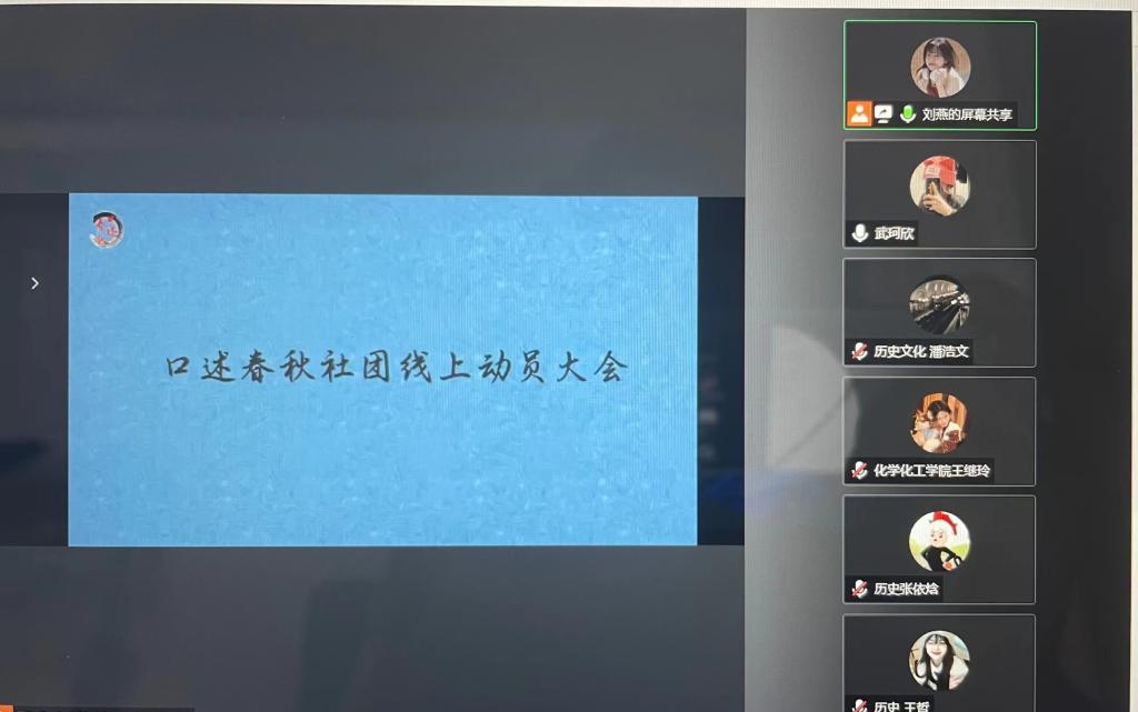 3月27日晚,历史文化学院口述春秋社团开展线上新学期培训动员大会,布置新学期社团工作任务,激发同学们对于口述史采访的热情,为顺利开展社团活动打下坚实基础。