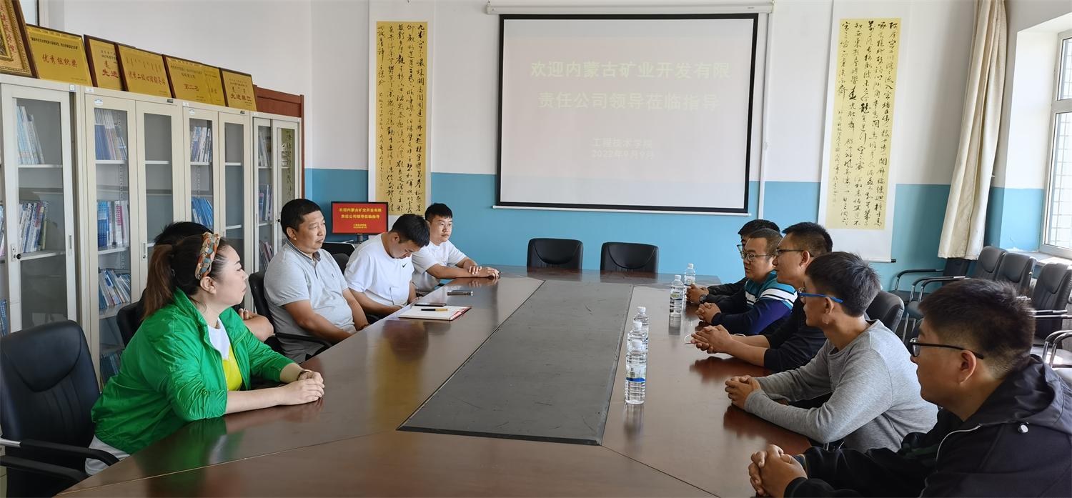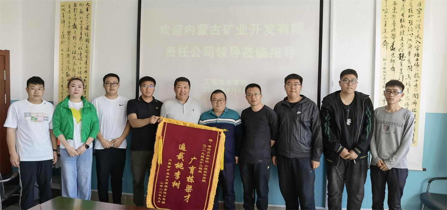 9月9日上午,内蒙古矿业开发有限责任公司子公司总经理李鹏,项目部负责人张国锋等一行人代表公司为工程技术学院送来锦旗,感谢学院为他们输送了高素质的学生,学院党总支副书记哈达,实验实训中心主任方明伟和团学办的辅导员老师一起接待了企业的领导。