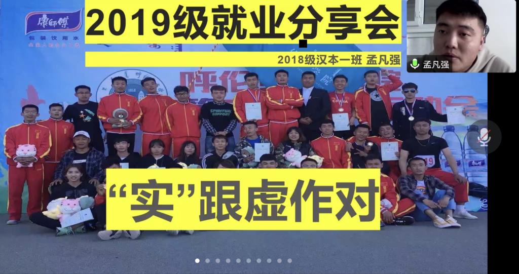 为进一步做好2023届毕业生就业创业工作,根据《呼伦贝尔学院2023届毕业生校园招聘月系列活动方案》,12月21日上午,体育学院邀请学院往届毕业生2018级体教汉本班学生孟凡强和孙颖在线为2023届全体毕业生做了就业经验分享会,学院党总支书记李伟艳、副书记胡日查、团学办全体教师和班主任参加了本次会议。
