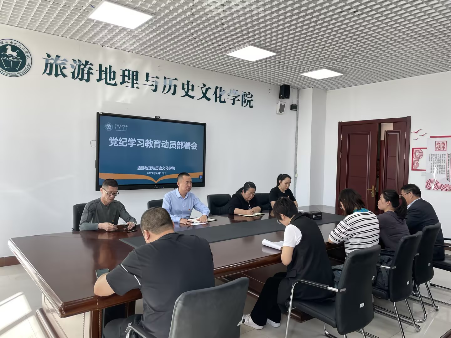 4月18日上午,旅游地理与历史文化学院组织召开党纪学习教育动员部署会,学院党总支书记、副书记及全体教职工党员参加了会议。会议由学院党总支书记赵金辉主持。