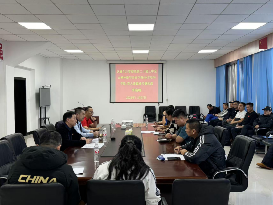 李晓峰围绕党的二十届三中全会的主题及其重大历史意义,聚焦关键领域,深入了解进一步全面深化改革的中心任务及重大措施,并结合学院实际,深入分析了全会精神对学院教育教学、人才培养、学科建设等方面的重要启示与积极影响。他强调,学习贯彻好党的二十届三中全会精神,是当前和今后一个时期的一项重大政治任务。全体教师要提高政治站位,加强党性修养,充分认识和把握全会精神的重要意义,不断探索创新教学方法与人才培养模式,提高学生的专业技能和实践能力,为国家培养更多优秀的体育人才。