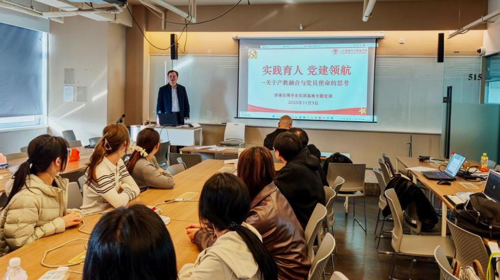 刘仁山以“实践育人,党建领航——关于产教融合与党员使命的思考”为题,为实训基地学生党员和积极分子讲授专题党课。他紧扣党的二十大精神,强调“党建领航”在推动产教融合中的核心作用,指出数字媒体技术专业学生应在实习中锤炼技能、担当责任。党课从党建引领方向、党员践行使命、专业培育匠才三个维度展开,鼓励学生党员带头攻坚克难,将初心使命融入作品创作。结合学院与安博的合作案例,他进一步阐述了“党建+实训”的实施路径,通过党支部共建、党员带头等举措,实现人才培养与价值引领的统一。同学们表示将以专业实践践行“强国有我”的青春誓言。