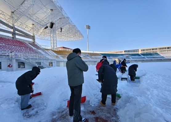 降雪过后,校园道路、东山校区体育场等处积雪严重,给师生出行与教学带来诸多不便。学院志愿者们主动请缨,不畏严寒、分工协作,手持铁锹、扫帚等工具,对办公楼、田径场、主干道等区域的积雪进行全面清理。体育专业学子凭借良好的身体素质,干劲十足、配合默契,铲雪、扫冰、除障一气呵成,忙碌的身影成为校园里一道温暖的风景线。