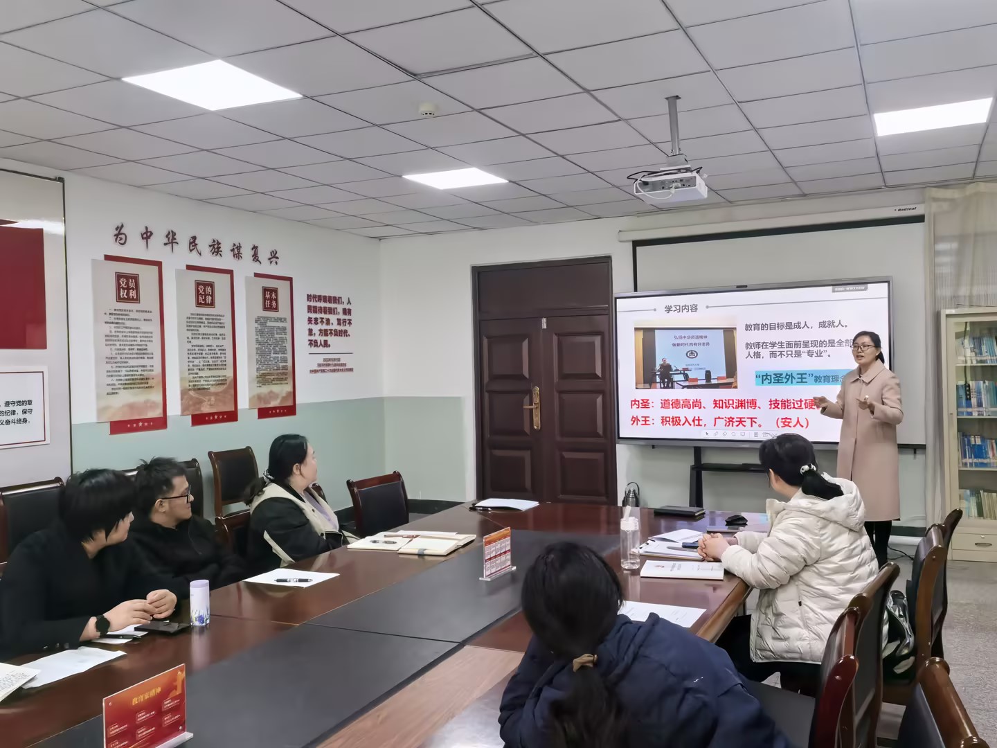 分享会上,齐霞围绕数智赋能、师德铸魂、理论领航、文化浸润四大板块,系统传达培训精髓。她重点讲解数智时代教育变革方向,分享AI技术在学情分析、教学设计、课件制作、思维导图生成等教学场景的实操方法,倡导教师从知识传授者向思维引导者转变,打造高效、创新、有深度的智慧课堂。在师德与育人理念分享中,她结合“内圣外王”教育智慧,阐释“教育的目标是成人、成就人”,强调教师应以完整人格浸润学生,坚守新时代“四有”好老师标准,强化师德修养与意识形态责任。同时,结合中华优秀传统文化与马克思主义理论学习感悟,引导教师坚定育人初心、提升思想境界。