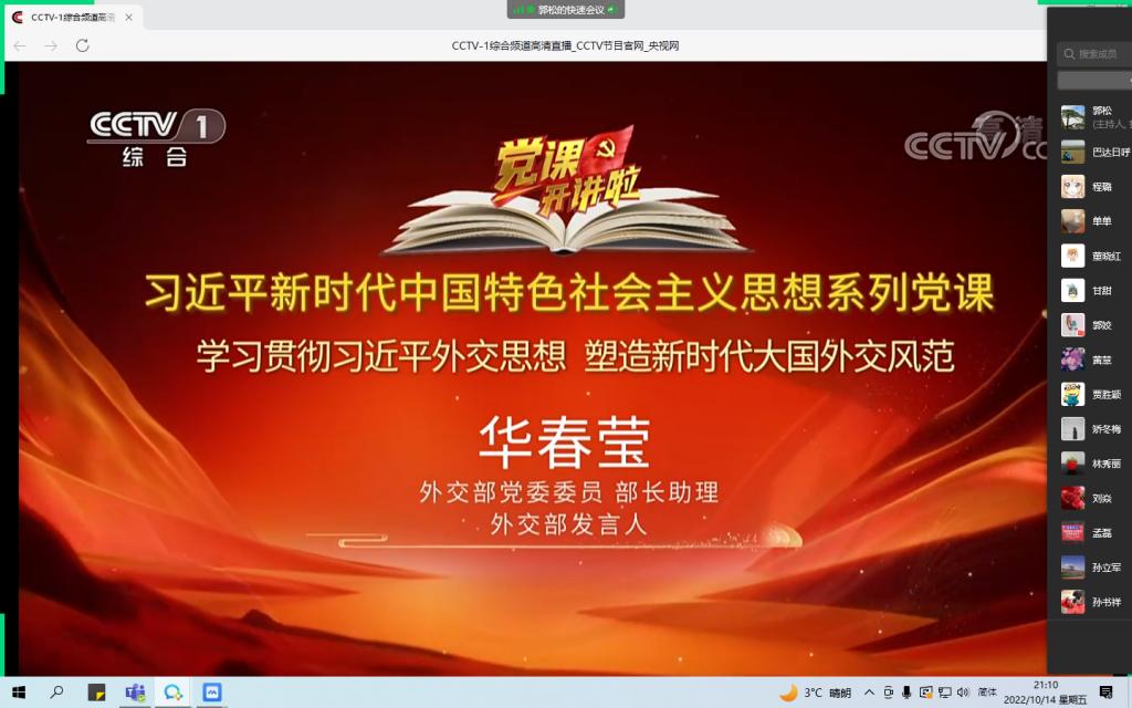 《党课开讲啦》习近平新时代中国特色社会主义思想系列党课之“学习贯彻习近平外交思想 推进中国特色大国外交”节目于10月13日至14日晚在中央电视台综合频道(CCTV-1)播出,我校第一时间转发学习通知,积极组织全校师生党员学习收看。本期党课由外交部党委委员、副部长谢锋,外交部发言人华春莹,分别以《学习习近平外交思想推进中国特色大国外交》《学习习近平外交思想塑造新时代大国外交风范》为主题,结合各自的工作经历,采...